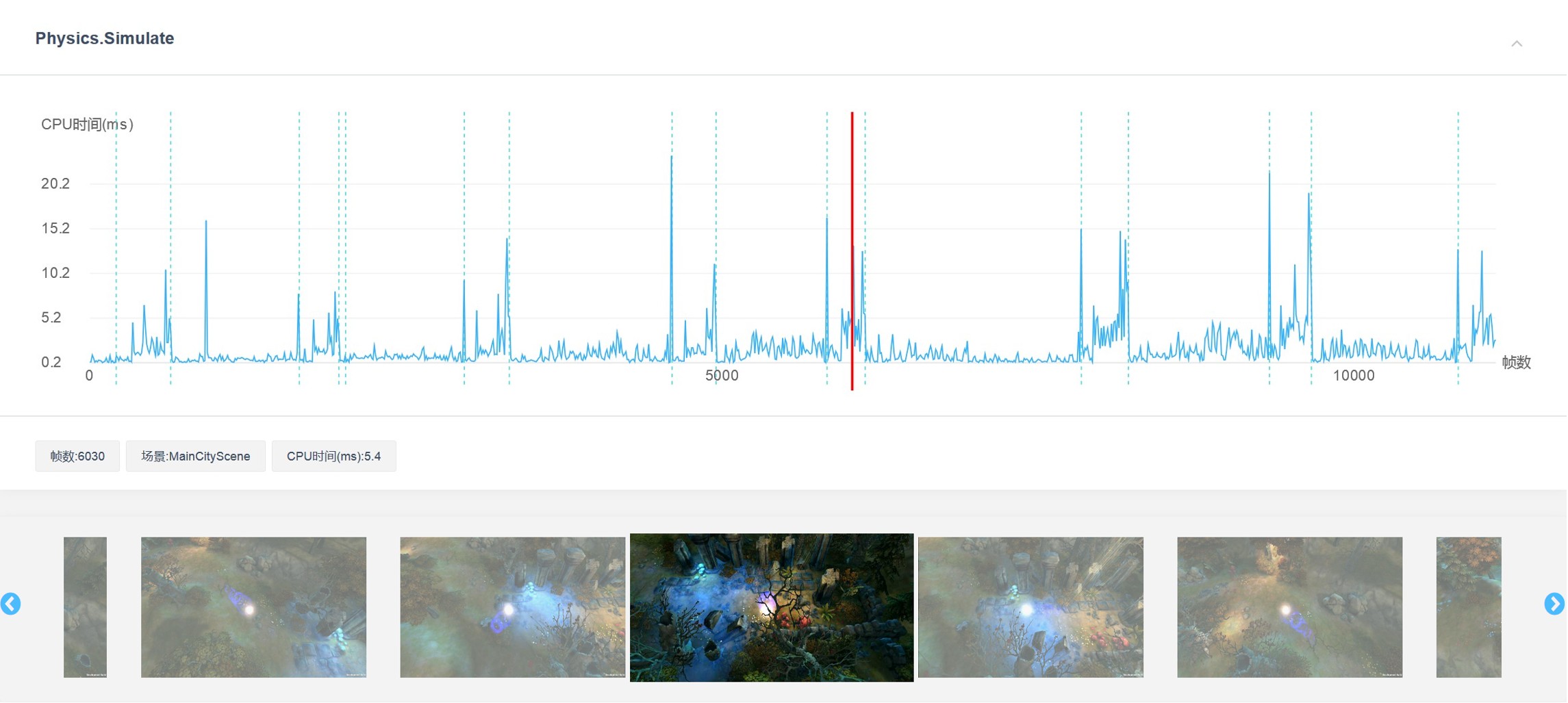该项主要展示项目运行过程中物理模块的具体耗时情况。对于Unity引擎而言,其4.x版本所使用的物理引擎为 Nvidia PhysX 2.8,5.x版本所使用的物理引擎为 Nvidia PhysX 3.3。您可以通过与图表交互,查看每一场景、每一帧的具体CPU占用情况。同时,当您选中图表的某一帧时,图表下方的场景图片会随之联动,将离该帧最为接近的项目截图显示给您,从而让您对性能开销的判断更为直观和准确。