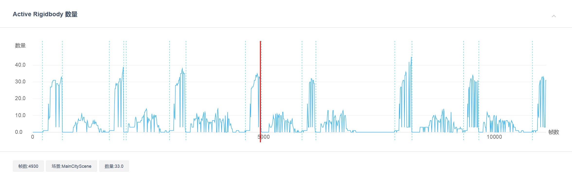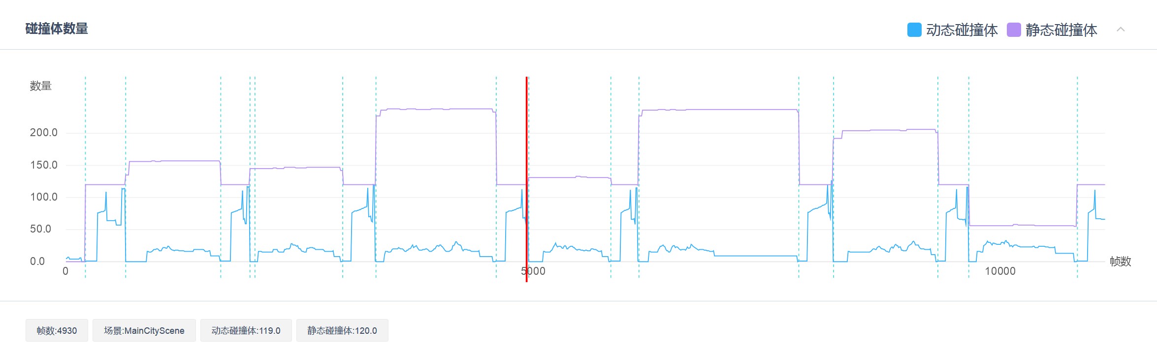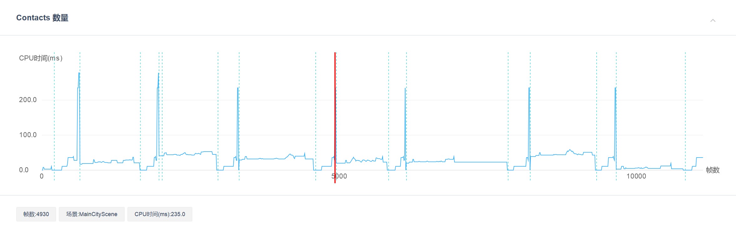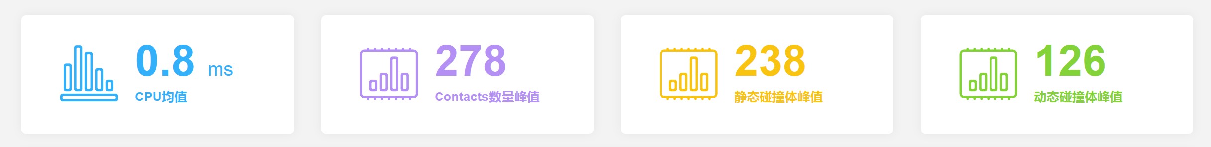 该项主要展示项目运行过程中的 “CPU均值”、“Contacts数量峰值”、“静态碰撞体数量峰值” 和 “动态碰撞体数量峰值”。其中,“CPU均值” 是指物理引擎(Physics.Simulate)每帧的平均CPU耗时。